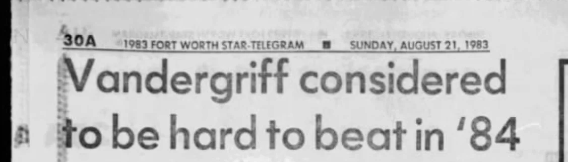 In 1983, Tom Vandergriff was in his first term as congressman representing Texas’s 26th District. A headline in the Fort Worth Star-Telegram in August that year ran with the headline, “Vandergriff considered to be hard to beat in ’84.”